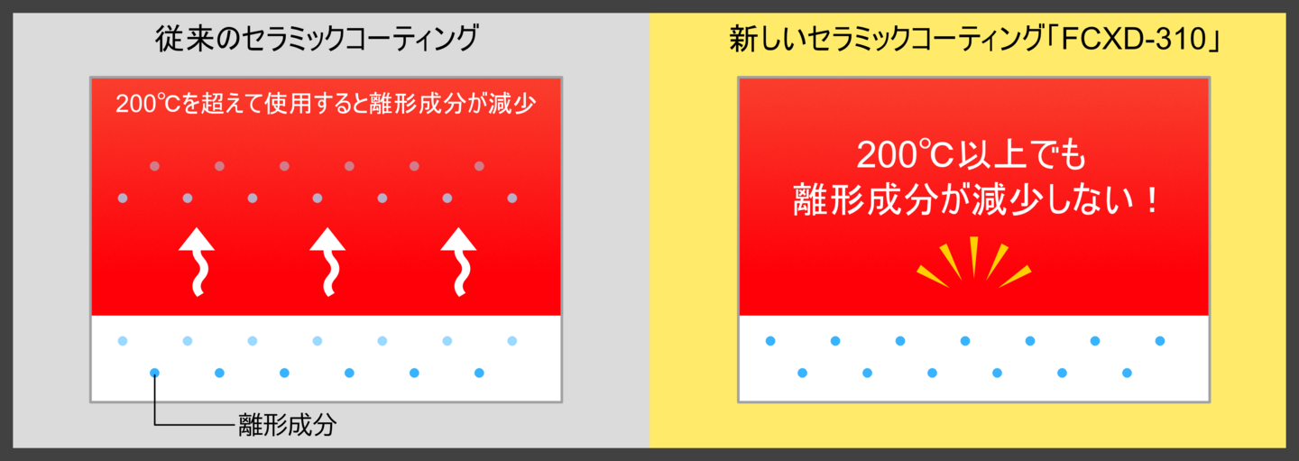 これまでのセラミックコーティングは、高い耐熱性や高硬度の塗膜に加え、優れた離形性を持つなどその有能さから様々な用途で使われてきましたが、200℃を超えると非粘着性や離形性が落ちてしまう弱点があり、そのため離形用途としては有効な範囲が限られていました。